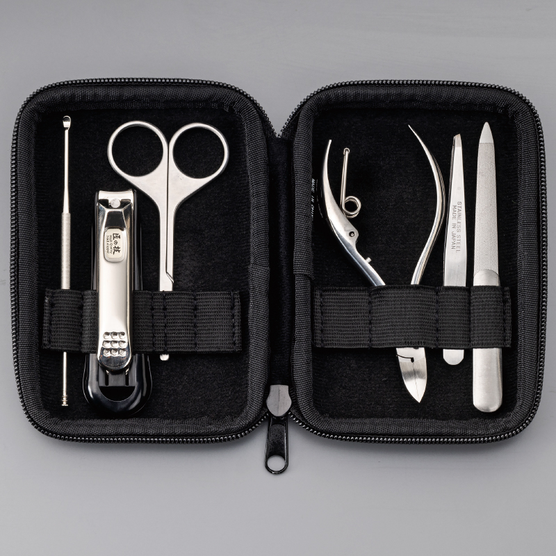 爪切り・ツメヤスリ・ニッパー・耳かき・毛抜き・セーフティはさみの6点セット。丈夫で高級感のあるケースで旅行や出張にも持ち運び便利です。